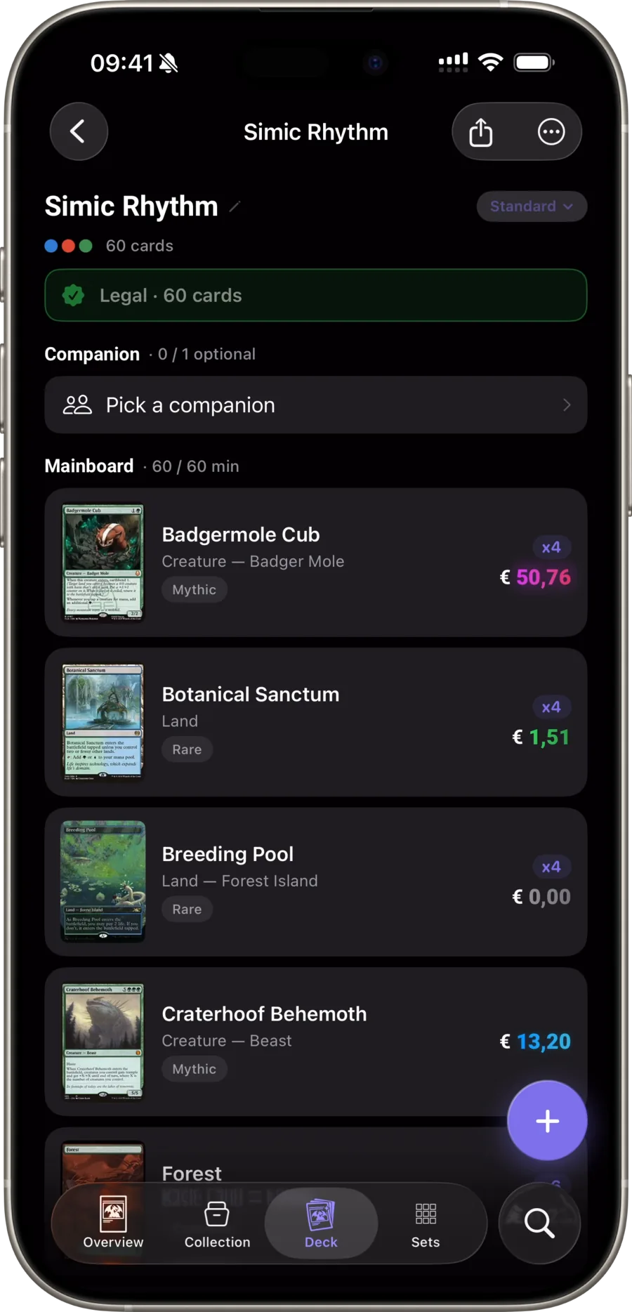 Стройте для Standard, Pioneer, Modern, Legacy, Vintage, Commander, Pauper. Слоты компаньонов, цветовая идентичность, сайдборд, бан-листы и кривая маны проверяются при добавлении карт.