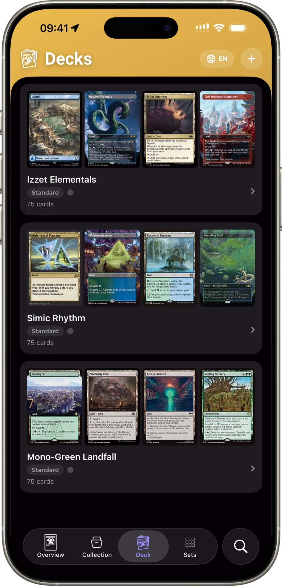Собирайте колоды в любом формате. Легальность и кривая маны проверяются сами.