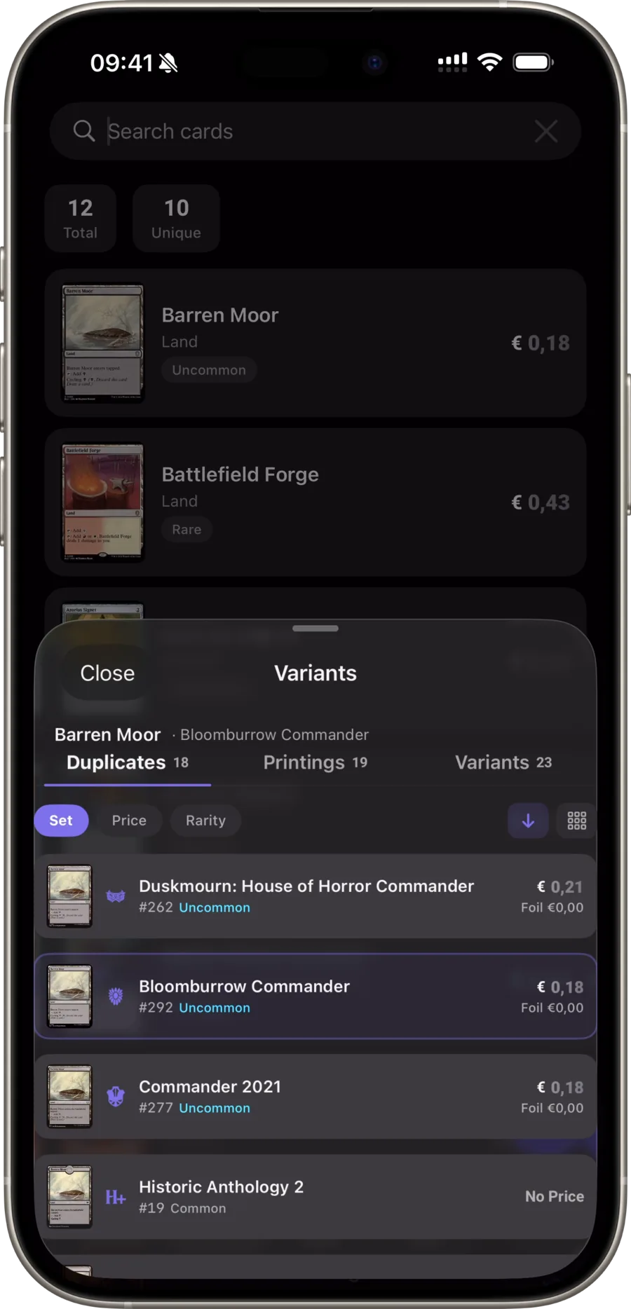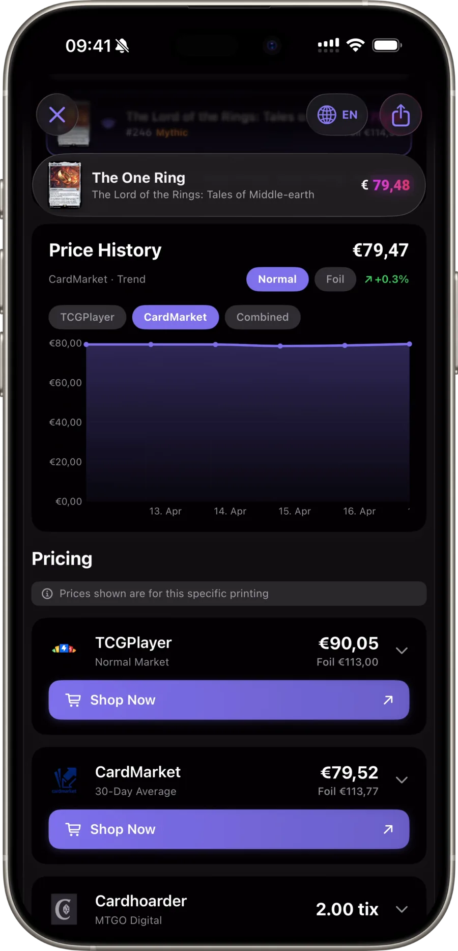 Каждая карта несёт 365 дней рыночных данных от Scryfall USD, CardMarket EUR и TCGPlayer — отслеживаемых отдельно по отделке. Фойл, etched и нон-фойл имеют собственные кривые.