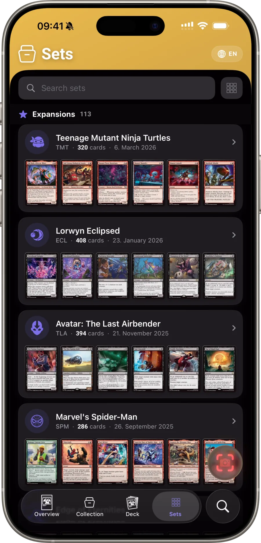 Сканер, трекер коллекции, конструктор колод и реестр цен для Magic: The Gathering. Сто тысяч уникальных печатей, девятьсот семьдесят один выпуск, триста шестьдесят пять дней истории рынка — на десяти языках.